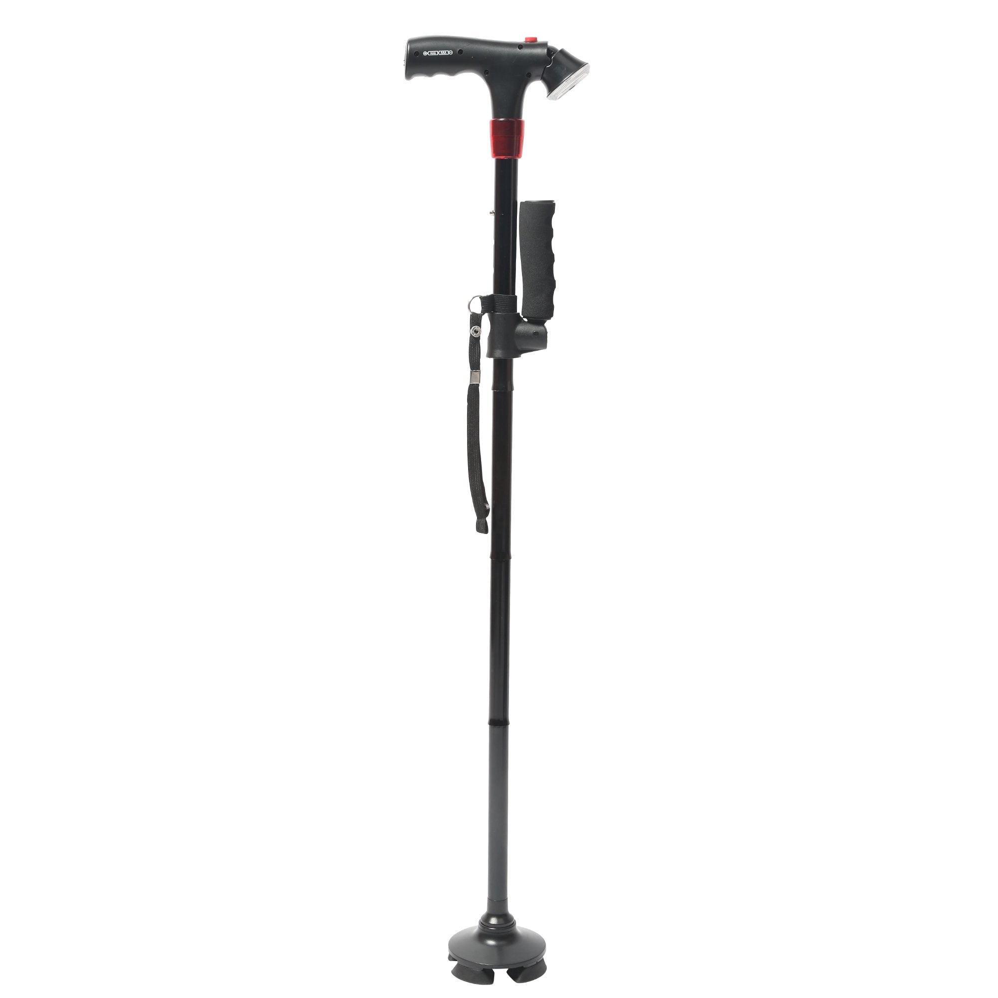Provides maximum safety and endurance while remaining lightweight. Ergonomically-designed grip handle together provide the user with maximum safety and comfort while exhibiting high quality and sustainability. Soft foam grip handle with pivoting head light with 6 built-in white LED lights to light up the way. Folding cane Stands up on its own
