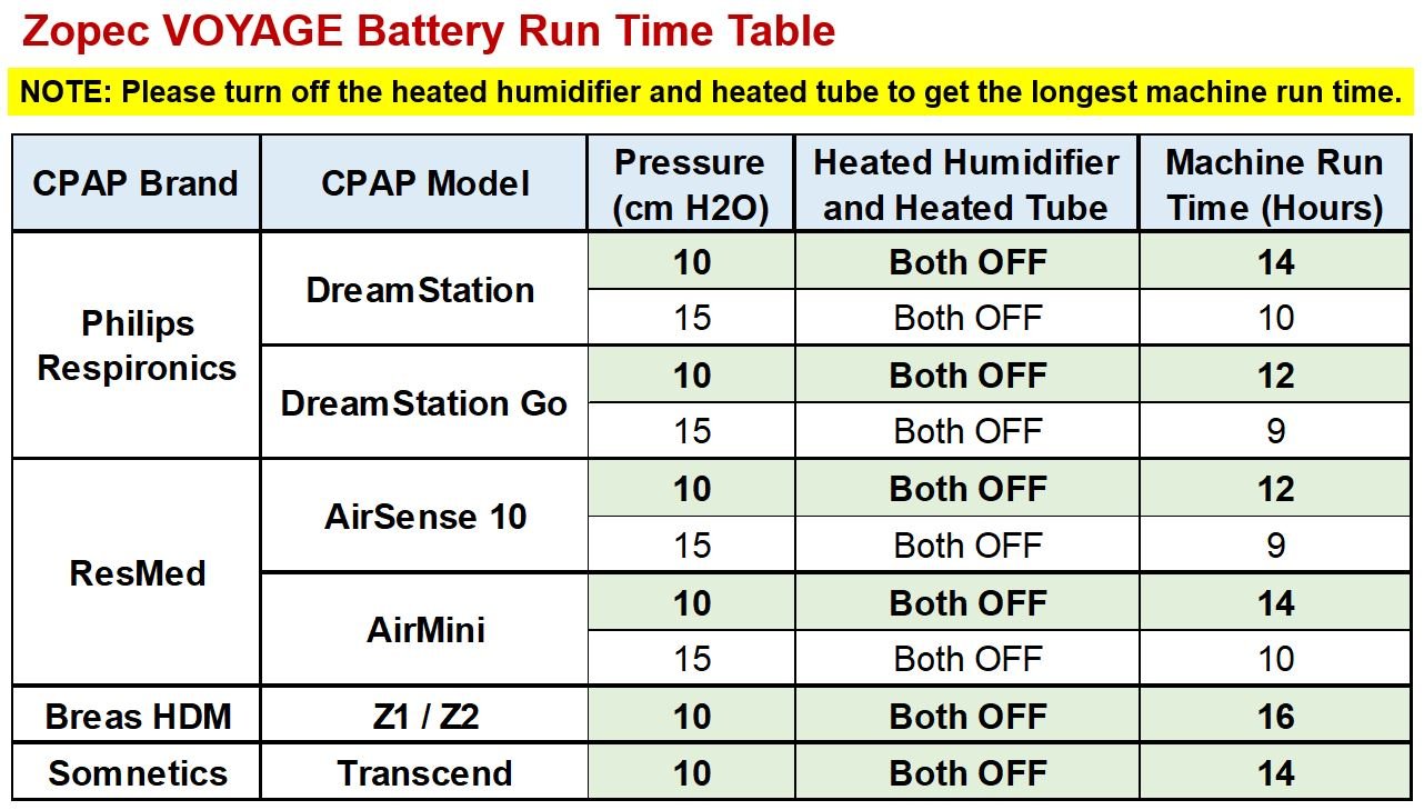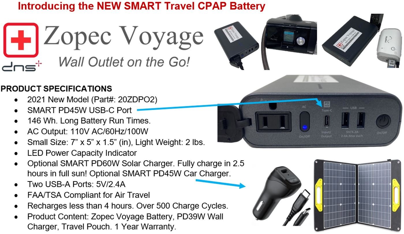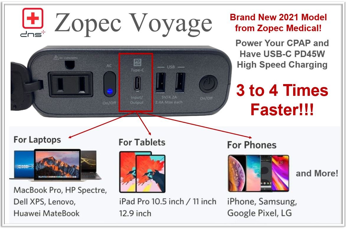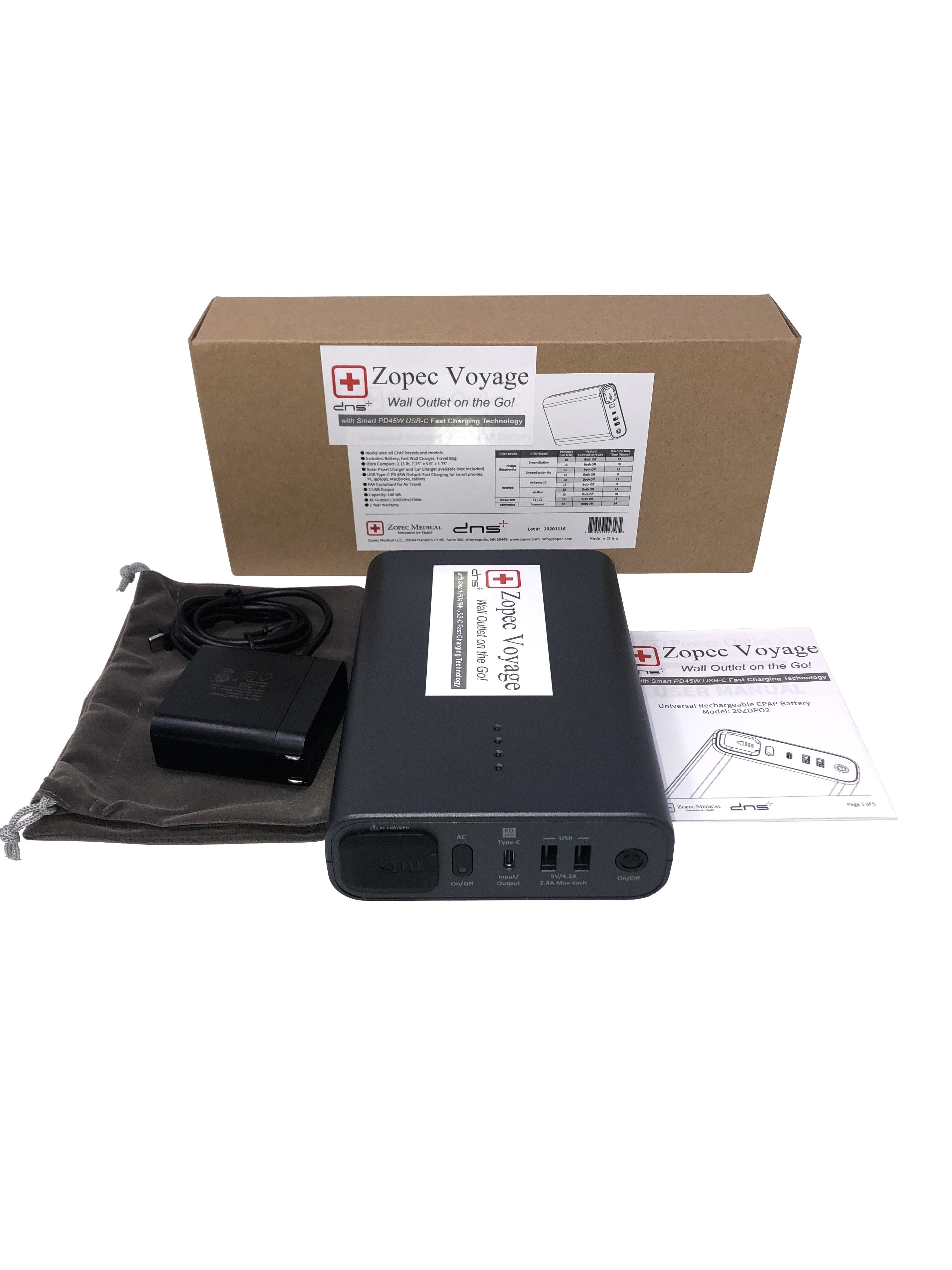 Zopec Medical introduces the SMART Universal Zopec Voyage Travel CPAP Battery! Enjoy a long-lasting travel CPAP battery with the convenience of USB-C PD45W high speed port!Powers All CPAP Brands and Models! NO ADAPTERS REQUIRED with 110V AC OUTLET. Just plug it in! Power your home and travel machines regardless brand differences.ULTRA SMALL and LIGHT for TRAVEL: 2.0 lb. 7.0” x 5.0” x 1.5”.POWERFUL and LONG RUN TIME: 1 - 2 nights WITHOUT Heated Humidifier and Heated Tube. (NOTE: Run time varies depending on the therapy pressures. All batteries will lose 50% – 80% run time if heated humidifier and/or heated hose were used.).Product Delivery (PD) is the Cutting-Edge SMART Charging Technology at Lightning Speed (3 – 4 times faster)! Most CPAP batteries only have regular USB, which can only charge 5V devices. Zopec Voyage's USB-C PD45W charges 3 - 4 times faster and can charge 5V, 9V, 12V, 15V, and 20V devices! No longer bring the chargers for all of your devices and have them tangled together! Just bring your lightning cables and leave other chargers at home! Compatible devices include:Apple: MacBook Air, MacBook Pro, Air Pods, iPads, iPhone 12, 12 Pro, 12 Pro Max, 12 Mini, iPhone 11,11 Pro,11 Pro Max, iPhone SE 2, iPhone XS, XS Max, XR, X, 8 Plus, 8, 7, 7 Plus.Samsung: Galaxy S20, S10, S10e, S10+, S9, S9+, S8, S8+, Note 9, Note 8.Other Devices: LG G7, V30+, Dell XPS, Lenovo ThinkPad, Nintendo Switch, Google Pixel, Pixel 3a, XL, Nexus 5X, 6P, Sony XZ2 Premium, Sony XZ3; Game Consoles, Tablets, Laptops and More.PRODUCT SPECIFICATIONS• 2021 New Model (Part#: 20ZDPO2)• SMART PD45W USB-C Port• 146 Wh. Long Battery Run Times.• AC Output: 110V AC/60Hz/100W• Ultra Small Size for Travel: 7.0” x 5.0” x 1.5” (in), Light Weight: 2 lbs.• LED Power Capacity Indicator• Optional SMART PD60W Solar Charger. Fully charge in 3 hours in full sun!• Optional SMART PD45W Car Charger.• Two USB-A Ports: 5V/2.4A• FAA/TSA Compliant for Air Travel• Recharges less than 4 hours. Over 500 Charge Cycles.• Product Content: Zopec Voyage Battery, PD39W Wall Charger, Travel Pouch. 1 Year Warranty.All Zopec items are not elgible for our standard return policy, please call if you have any return questions.