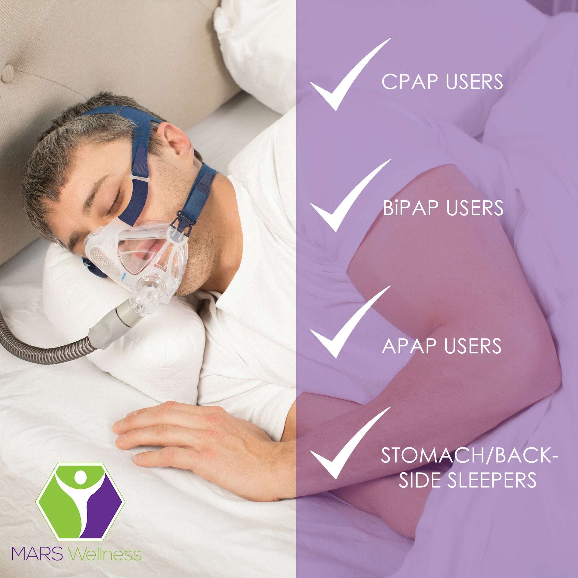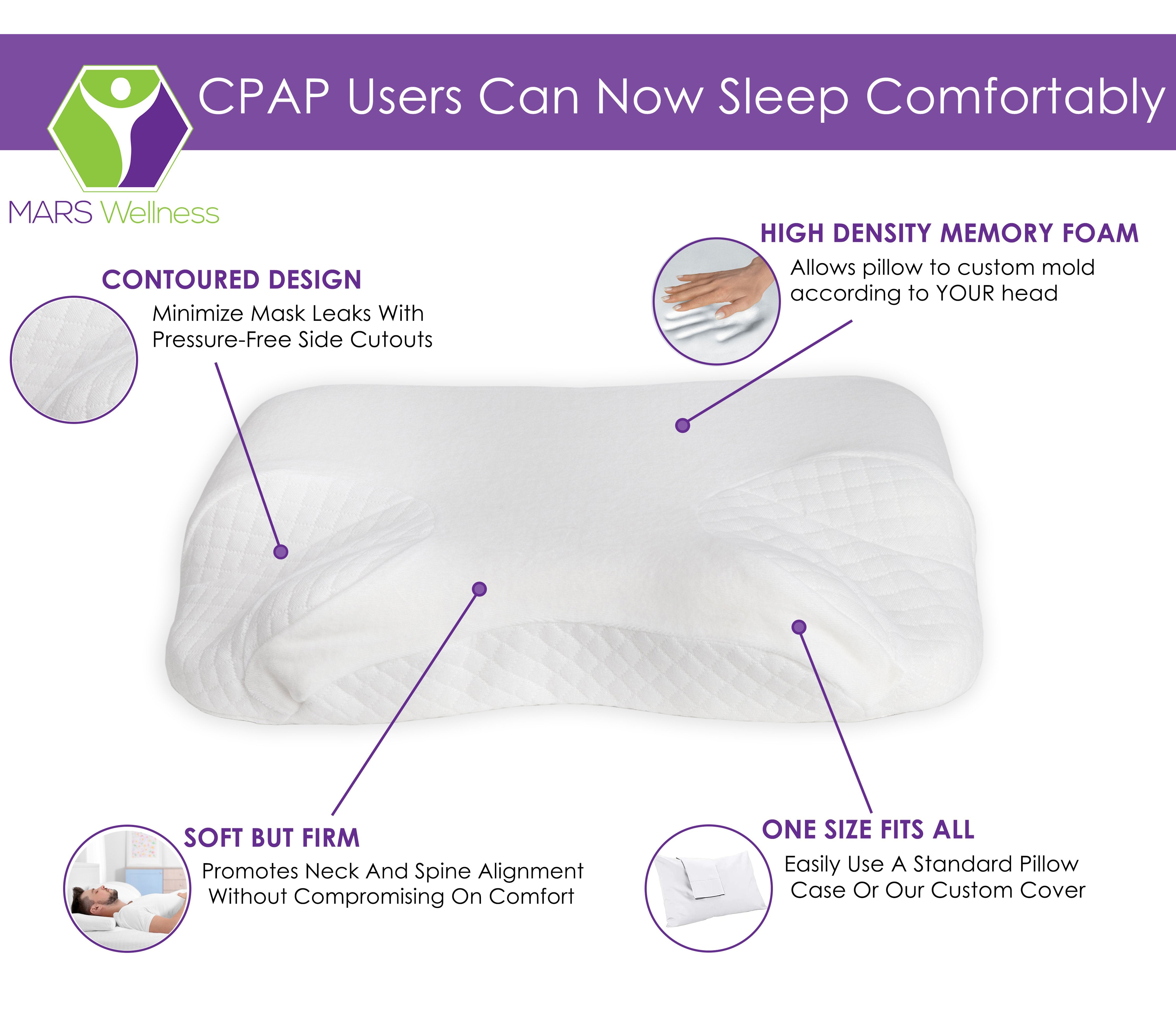 The Mars Wellness CPAP Pillow with Pillowcase is designed for CPAP and BIPAP users to help prevent problems that occur with standard pillows. Stomach, face and side sleepers can use the CPAP Pillow to position the CPAP mask and tubing.