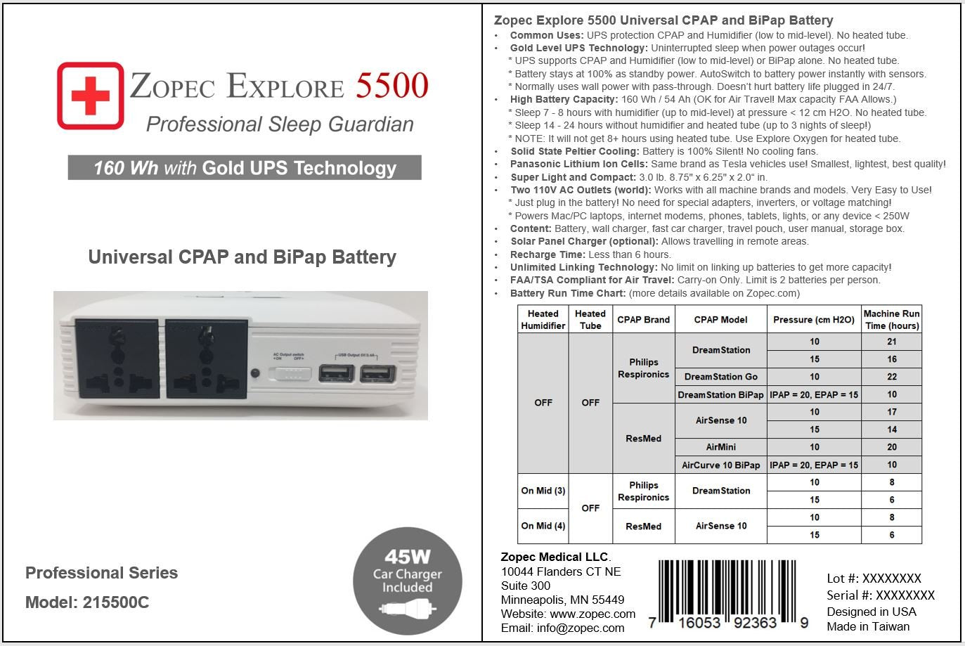 Zopec EXPLORE 5500 CPAP Backup Battery with Online UPS (up to 3 nights, Gold Level)