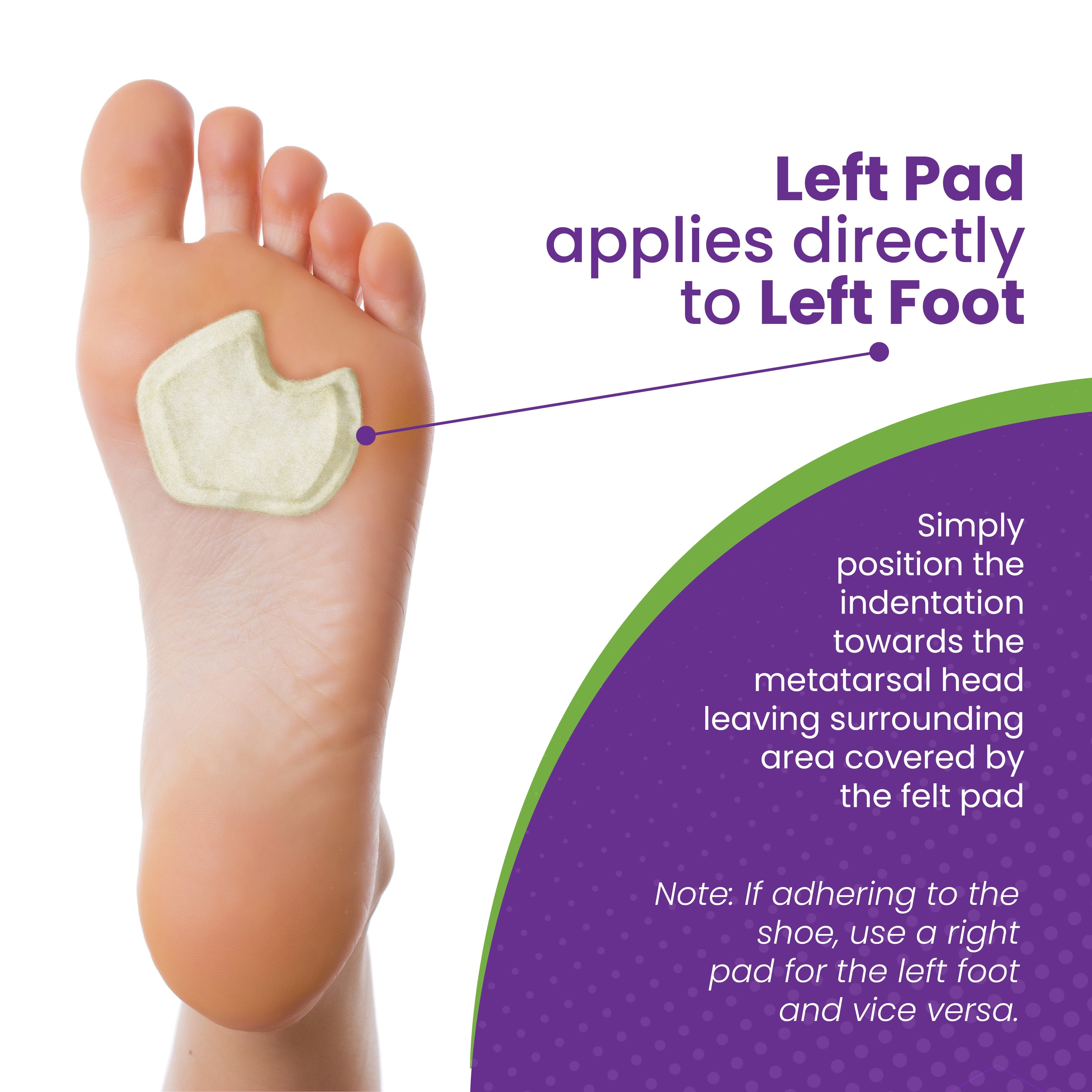 Dancer's Pads - Premium Felt are adhesive-backed support cushions that offer relief from forefoot pain by off-loading weight from the ball of the foot and the great toe joint. The cut-out area surrounds the great toe joint and redistributes weight onto the pad, relieving forefoot pain caused by many conditions of the feet. These pads get their name from their skived (rounded) edges and are often used by dancers to relieve forefoot pain. Right/left specific