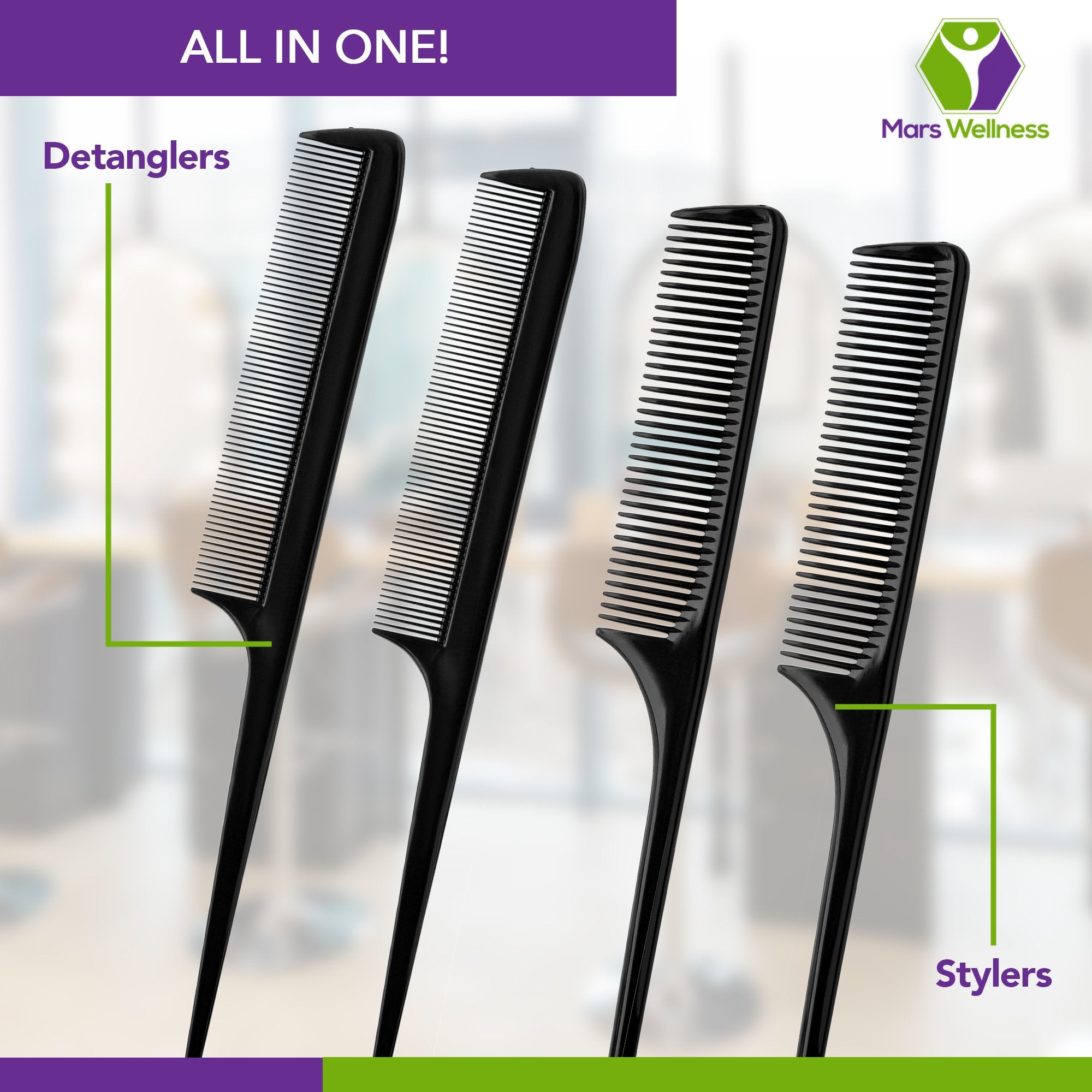 Mars Wellness Rattail Comb Pack: The women and mens comb pack is one with 2 fine tooth rattail combs & 2 wide-tooth rattail combs. 8.5” in length, these hair parting tools are long enough to be gripped perfectly for the hairstyle you want. Made with the US quality standards, this styling comb for hair is a painless solution to damp and wet hair. Our 4-piece fine & wide tooth comb detangler avoids tangling and knotting. Use the wide comb for detangling the frizz out of your hair & the fine comb for getting that dreamy slicked back look! Carry this hair styling comb pack with you to be prepared for any impromptu plans! --- About Us: At Mars Wellness, we aim for complete customer satisfaction. We won’t settle for anything less. If for any reason you are not satisfied with our products please reach out to us right away, so we can help you.
