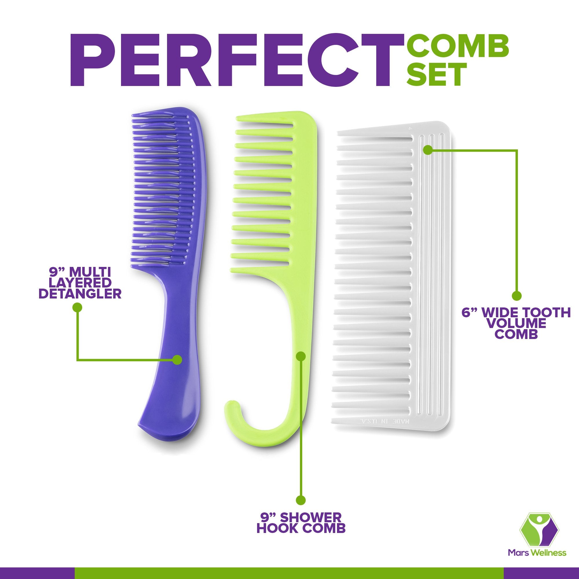 THE PERFECT COMB KIT - The Mars Wellness 3 Piece Detangling Shower Comb Set is a professional grade combo that includes a 9†Multi-Layered Detangler, 9†Shower Hook Comb, and 6†Wide Tooth Volume Comb