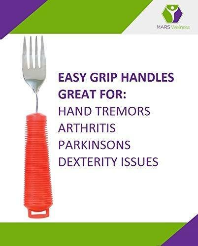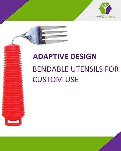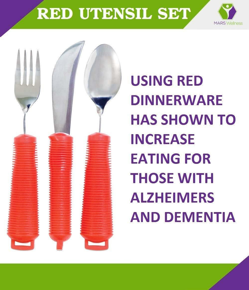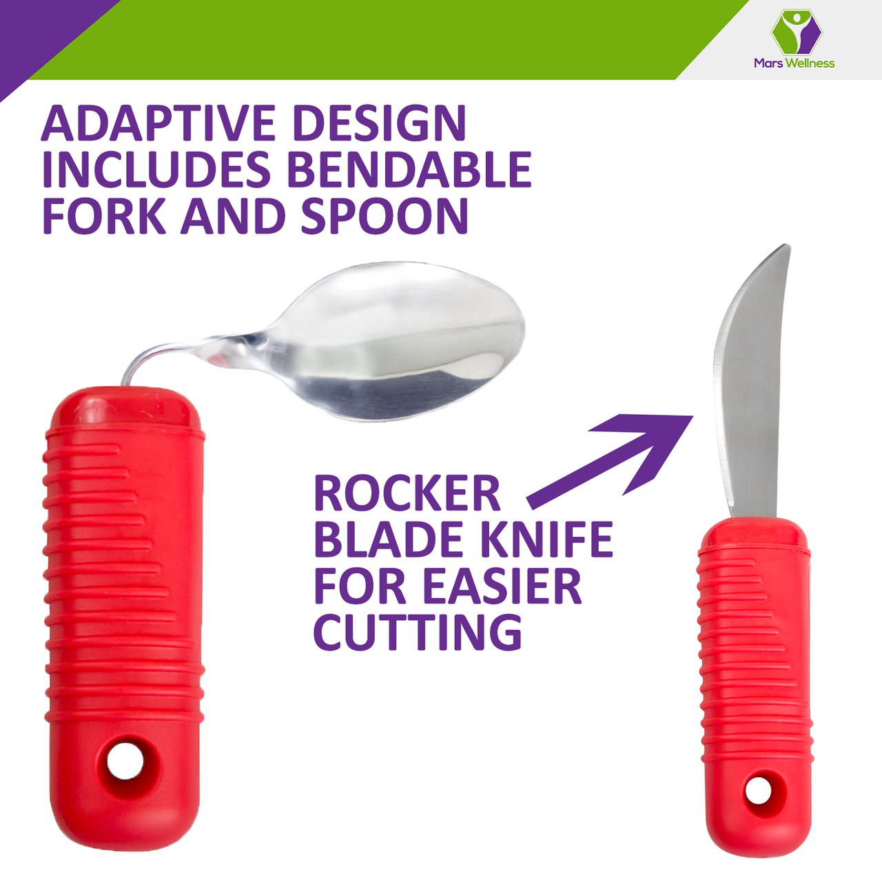 3 Piece Super Easy Grip Red Flatware Set - Bendable Built Up Large Fork, Knife, and Spoon