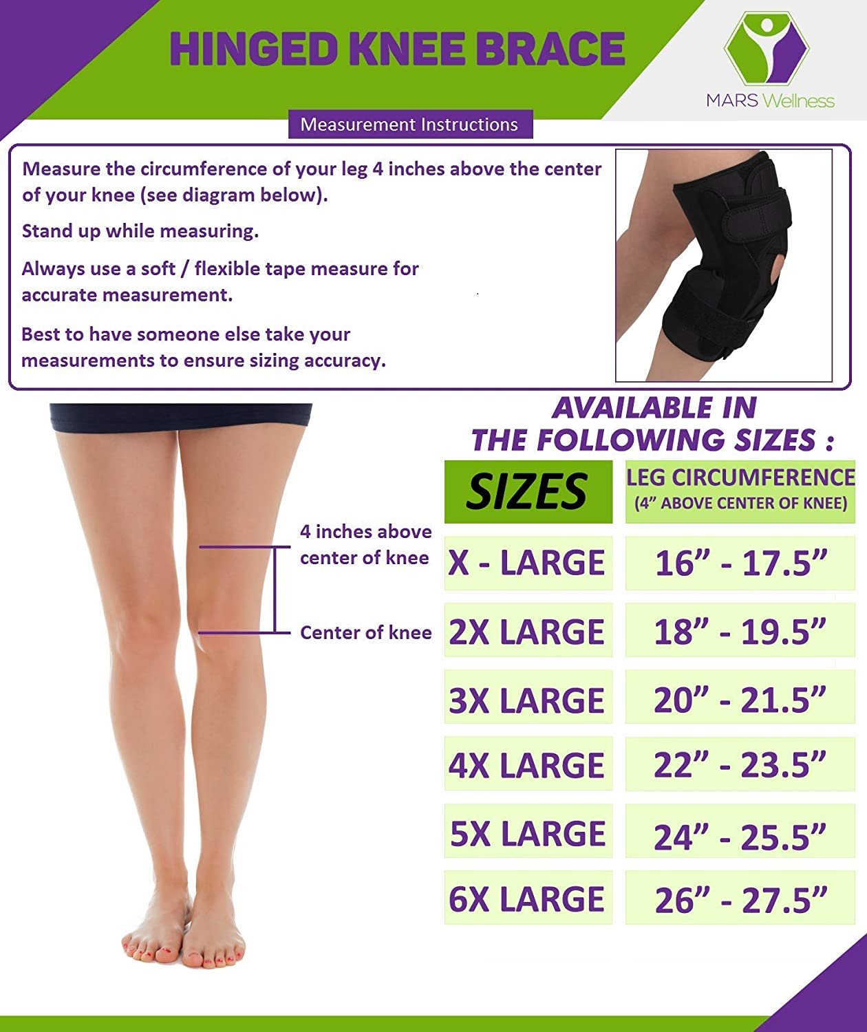 The bariatric plus-size knee brace from Mars Wellness provides stability to the knee for pain relief and protection from further knee injury. It features easy application and a comfortable fit for people with larger legs and thighs. This hinged extra large knee brace comes in a variety of sizes, including XL, XXL, XXXL and even 4XL, 5XL, and 6XL plus size knee braces. Our bariatric knee brace for large people is made of comfortable neoprene with nylon on either side of the support, making this an ideal compression knee treatment for arthritis. It features dual axis polycentric hinges that provide support both to the medial (inner) side of the knee and the lateral (outer) side. These hinges can also be removed for a sleeker, less bulky fit, making this a great plus size knee wrap. This plus-size knee support is easy to apply and adjust. It has a wrap-around design with strap tabs that are secured with Velcro, making it easy to put on and adjust the amount of compression it applies. The knee brace's closure is in the front (anterior) area of the support for easy access and patient comfort. This large neoprene knee brace also provides even compression and warmth across the area it covers, in the interest of reducing inflammation and promoting blood flow. This knee brace can help treat and ease discomfort associated with knee arthritis, knee ligament sprains and strain, general knee instability, and can speed along the healing process for a number of knee injuries so you heal faster. The neoprene and nylon material of this bariatric knee brace is comfortable, flexible and soft, making this extra- large knee brace easy to wear.
