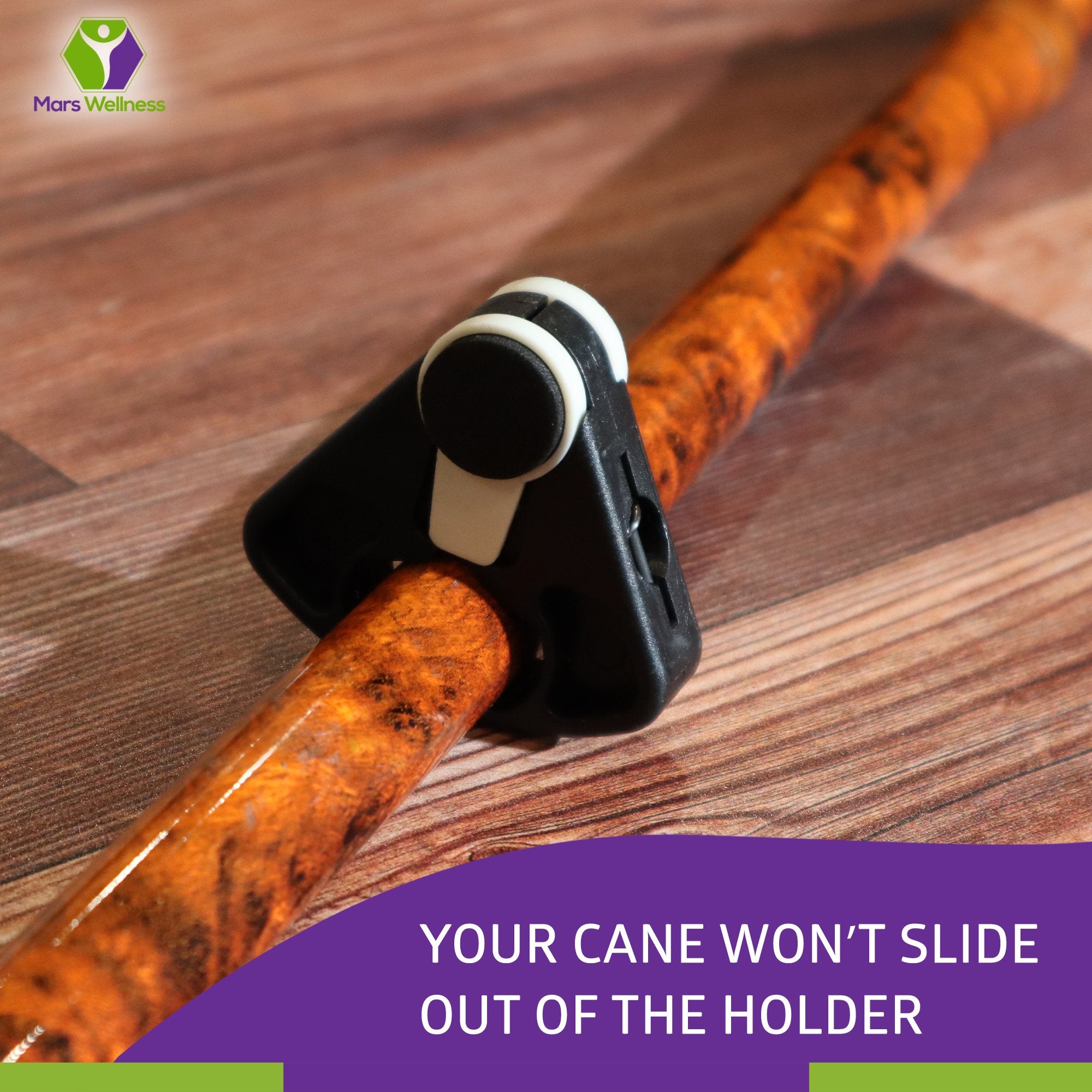- YOUR CANE WON’T SLIDE OUT OF THE HOLDER: Each cane holder (two are included) has a spring-loaded clip. Why is this important? This clip keeps the cane, crutch, or walking stick securely locked in place. It will not slide out of the holder, ever.