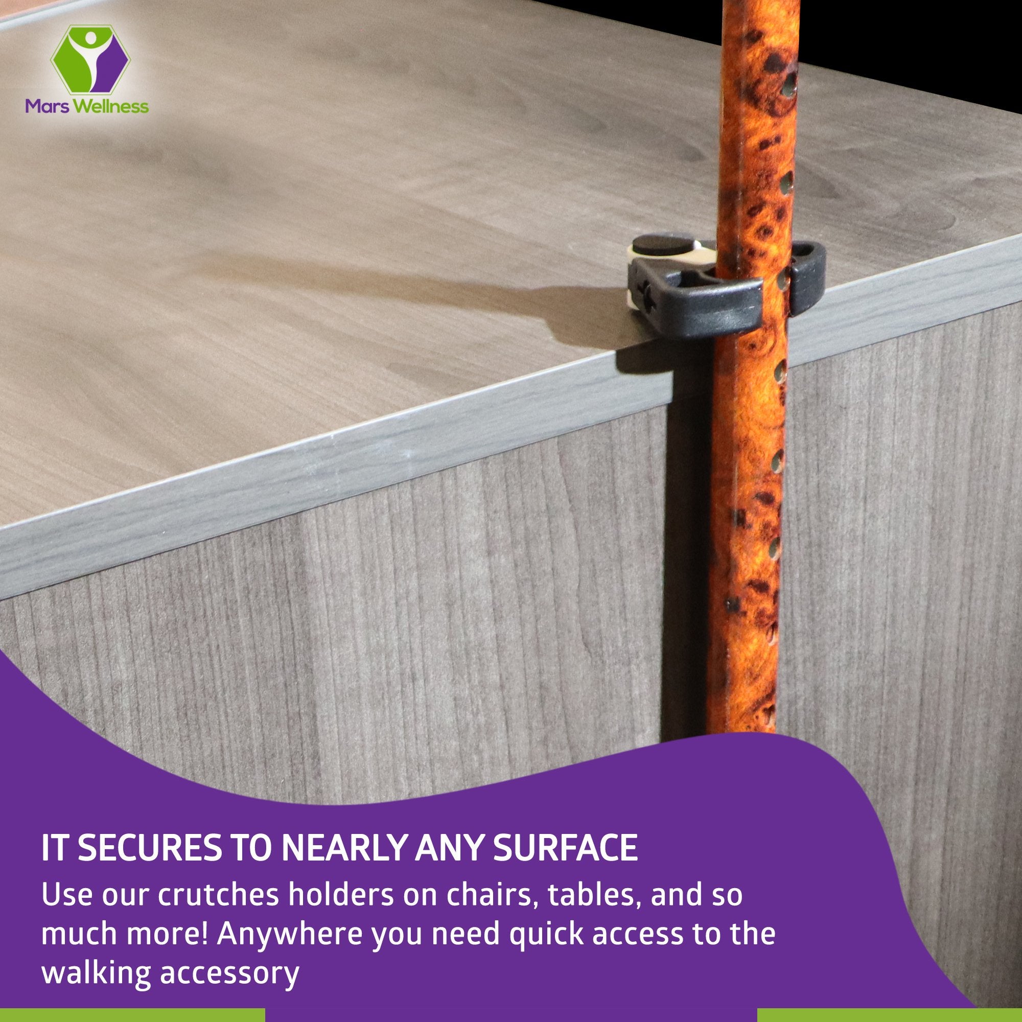 - IT SECURES TO NEARLY ANY SURFACE: Use our crutches holders on chairs, tables, and so much more! Anywhere you need quick access to the walking accessory. Also, each grabber is made with foam to prevent it from sliding off of the table.