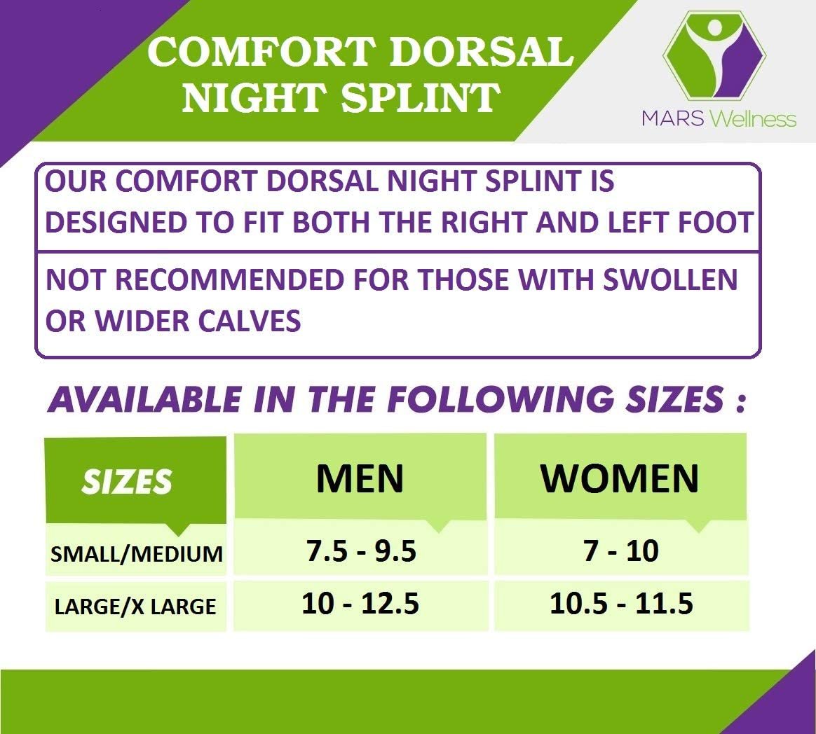 MARS Wellness Comfort Dorsal Night Splint  is primarily intended for treating Plantar Fasciitis and Achilles Tendonitis, and may be ideal for other conditions recommended by a physician. The purpose of this light weight plantar fasciitis night brace is to keep the patient's ankle in a neutral position overnight, passively stretching the calf and plantar fascia during sleep. This gentle stretch helps reduce the muscle contracture, inflammation and associated pain. The lightweight, low profile shell is sturdy and breathable and has three padded straps with buckles to ensure immobilization. In addition, the padding features a washable Lycra covering that is cool against the skin for maximum comfort.