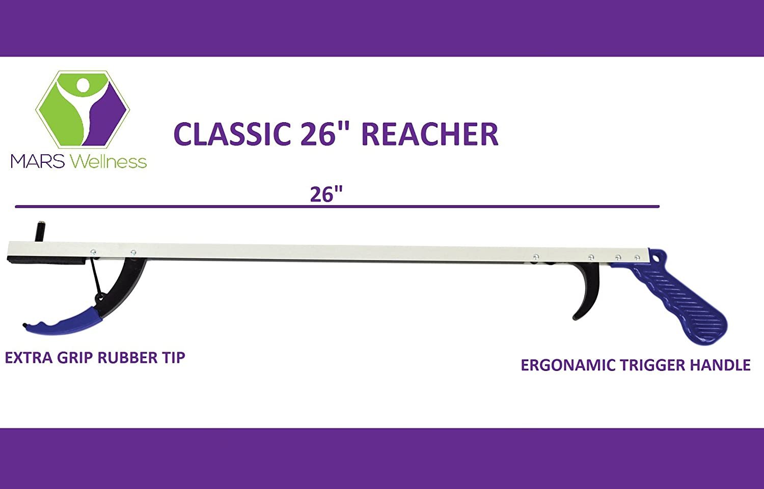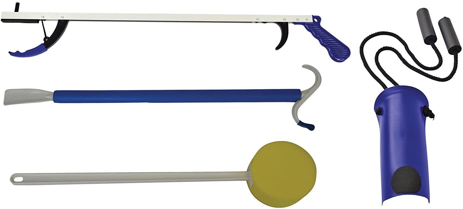 - PREMIUM 4 PIECE SET: 1x Reacher Grabber, 1x Sock Assist, 1x Shower Back Scrubber, 1x Dressing Stick.