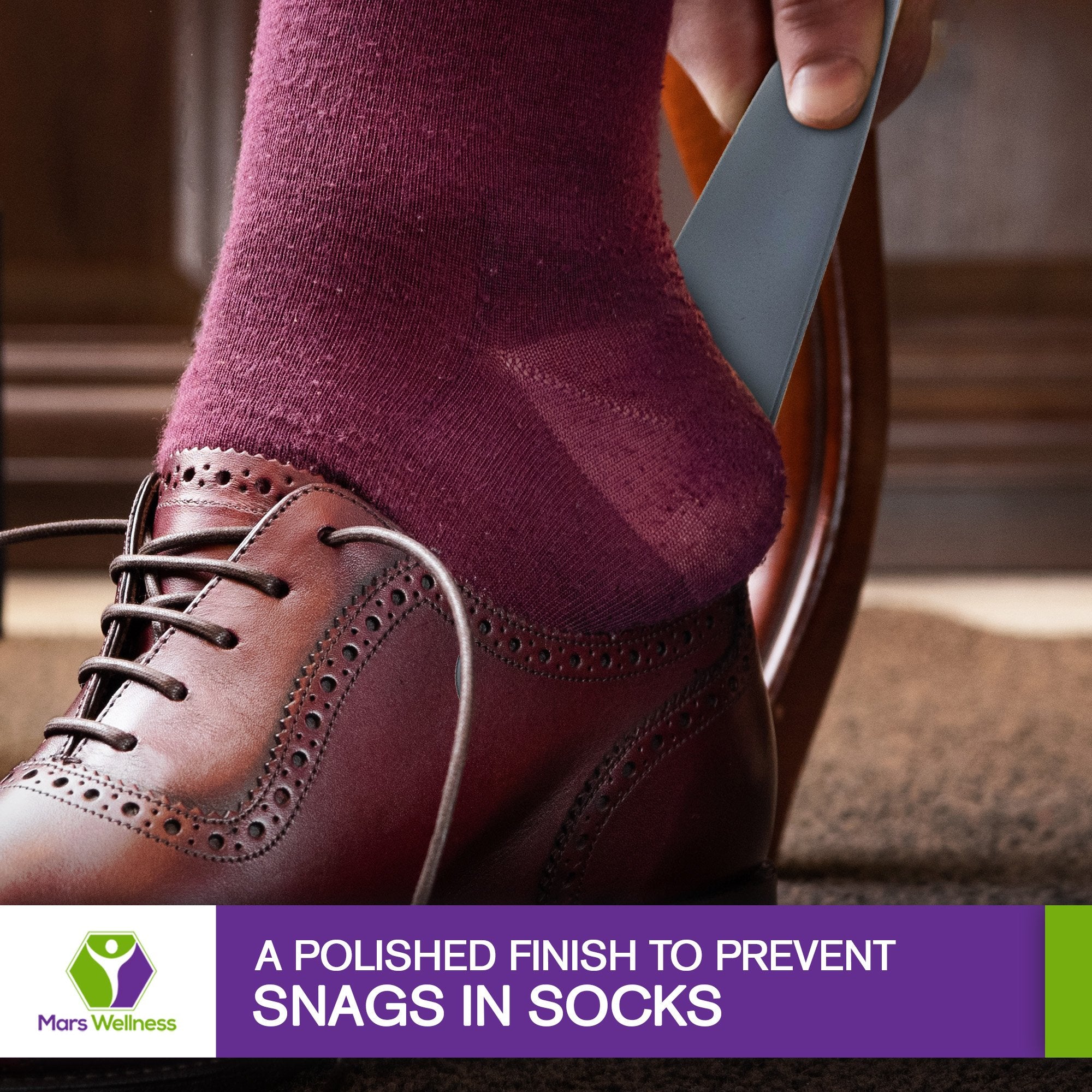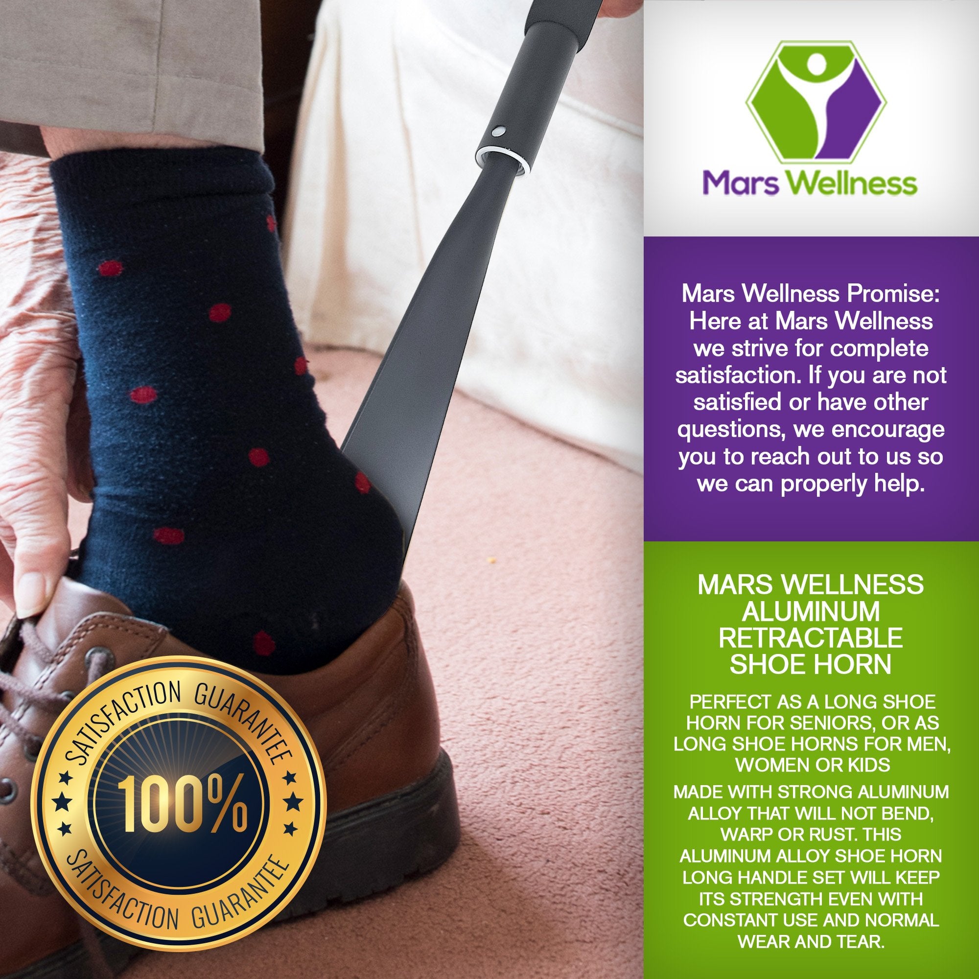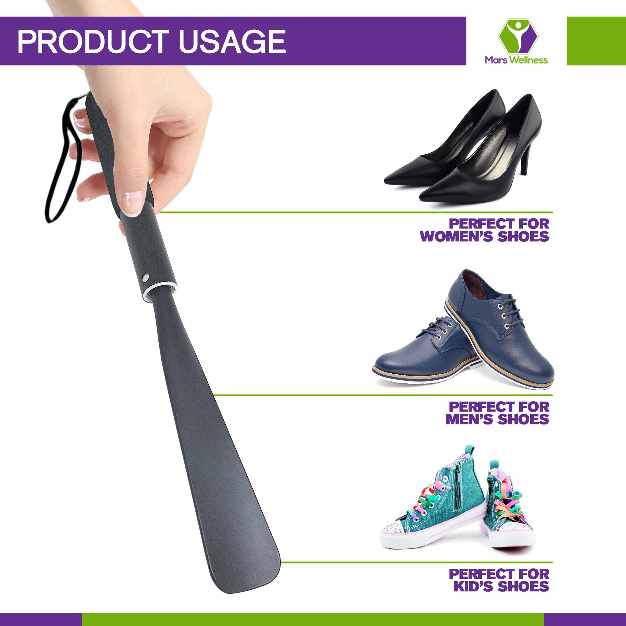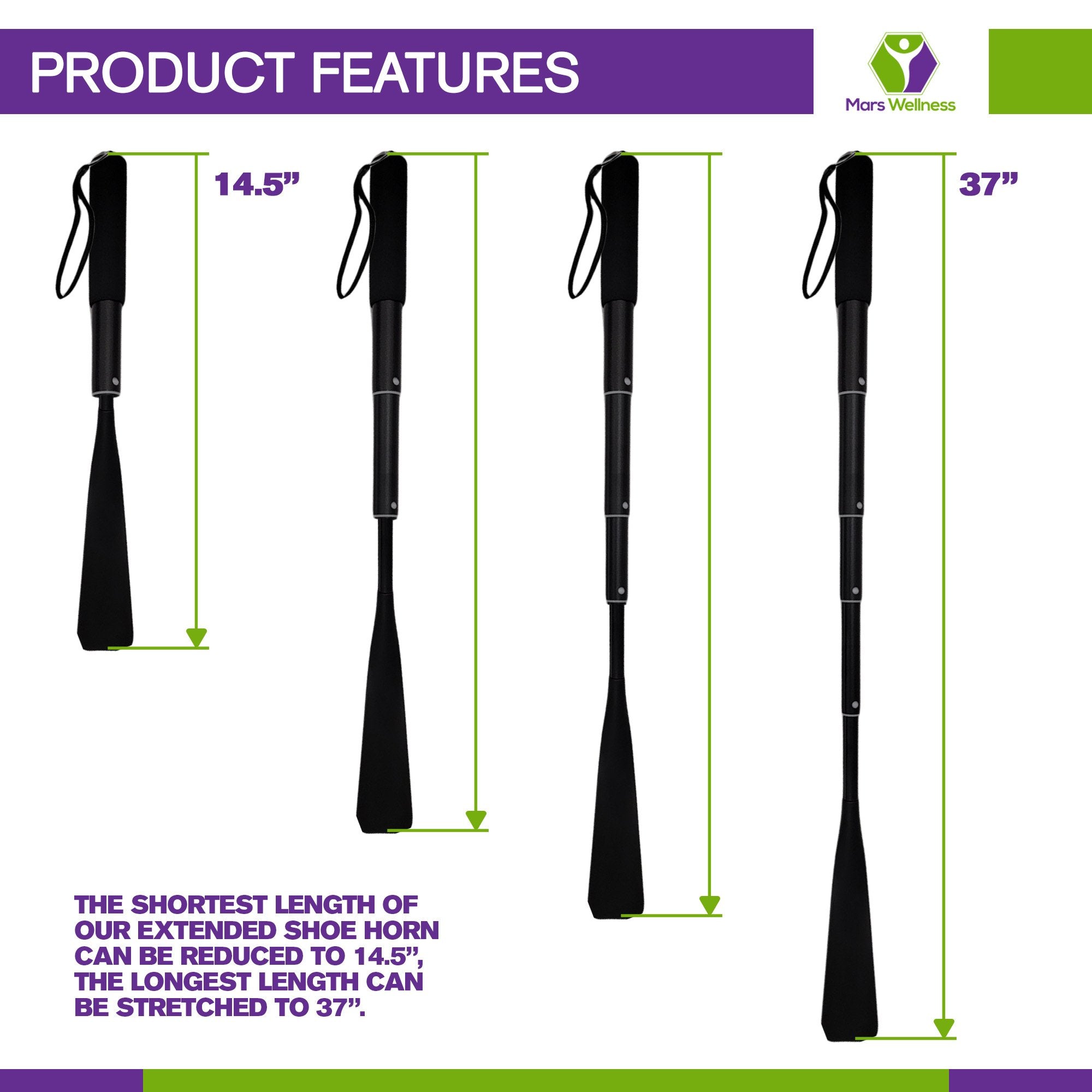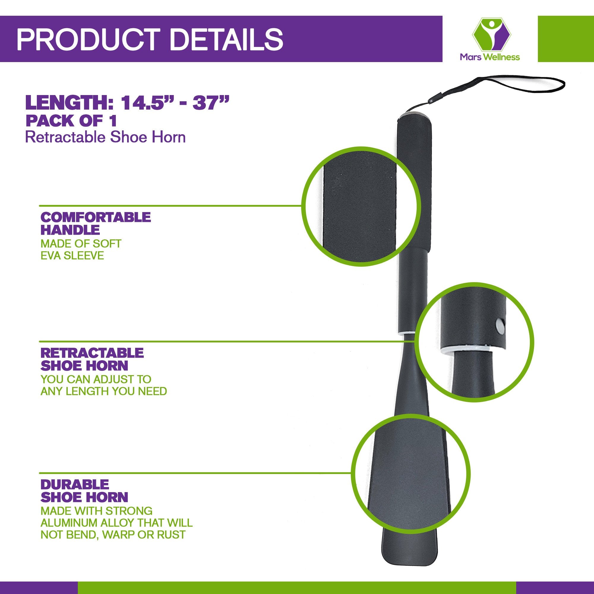Our Expandable Telescoping Shoe Horn is the best and most adaptive shoe horn on the market. Expands from 14.5 to 37 inches to perfectly fit your preferred size and comfort. High quality aluminum is durable and strong, yet light weight and portable. Use while standing or sitting without bending over, perfect for the elderly, pregnant or disabled and those with back pain, hip pain, arthritis, sciatica and other mobility problems.LONGEST SHOE HORN ON THE MARKET - Expands from 14.5" to 37" to perfectly fit your preferred size and comfortCAN BE USED IN ALL POSITIONS - Use while standing or sitting without bending over, perfect for the elderly, pregnant or disabled and those with back pain, hip pain, arthritis, sciatica and other mobility problemsBUILT & DESIGNED TO LAST - With its precision-engineered high quality aluminum manufacture - this shoe horn is lifetime guaranteed not to bend, break or failFINALLY MAKE BACK PAIN A THING OF THE PAST - Our Shoe Horn is the ultimate daily living aid. Collapse and even slip it in your travel luggage.