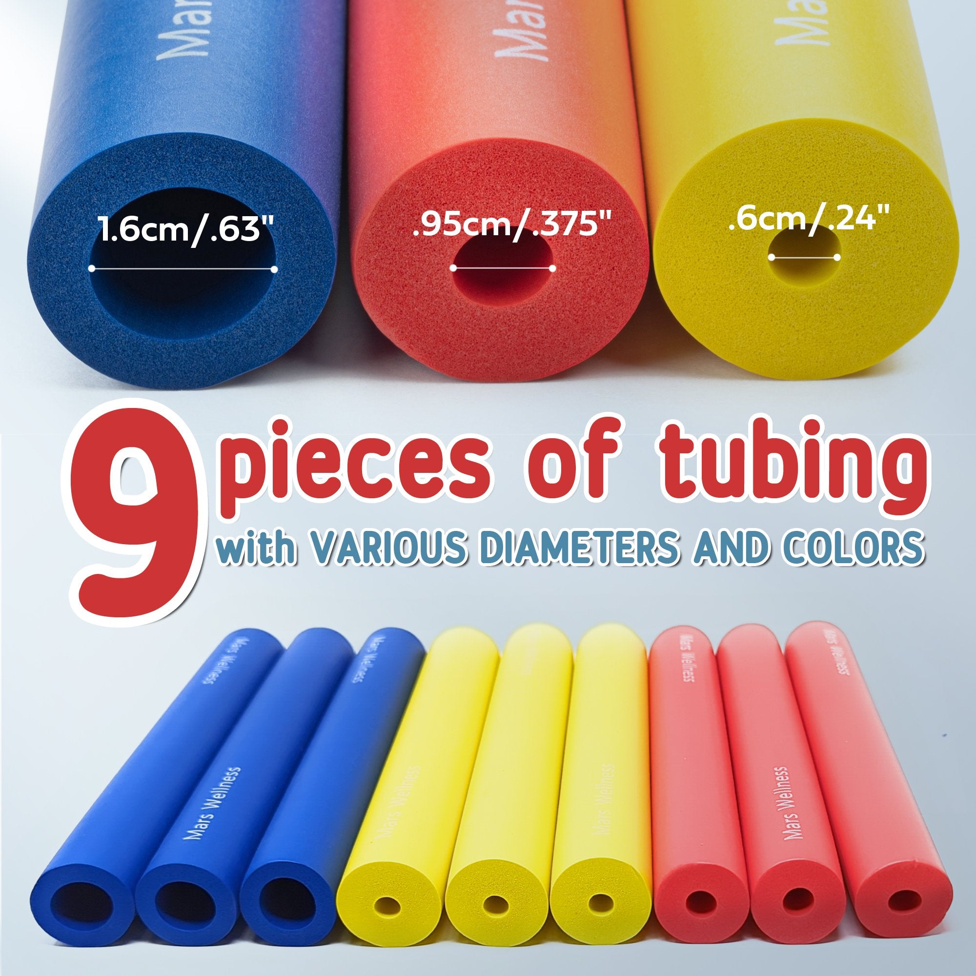 9 PIECE ASSORTMENT VARIOUS DIAMETERS AND COLORS: 9 pieces of tubing. Three blue foam tubes have a diameter of 1.9cm and are perfect for knives and thicker utensils. The yellow foam tubes are .95cm and are most useful for spoons and fork. The smallest red colored foam tubing is .6cm in diameter and is best used for pens, pencil and toothbrush