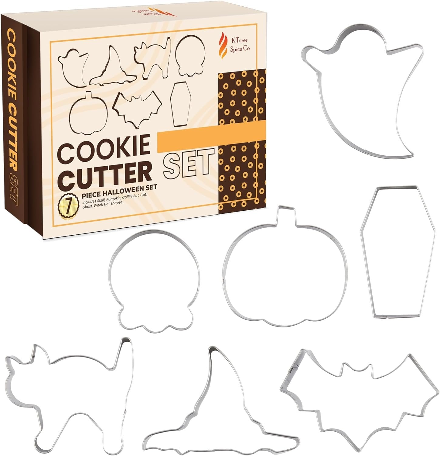 K'Tores Spice Co Fall Cookie Cutters - Halloween Cookie Decorating Kit - 7 Piece Stainless Steel Set with Pumpkin, Skull, Coffin, Bat, Cat, Ghost, Witch Hat Cookie Cutter Shapes