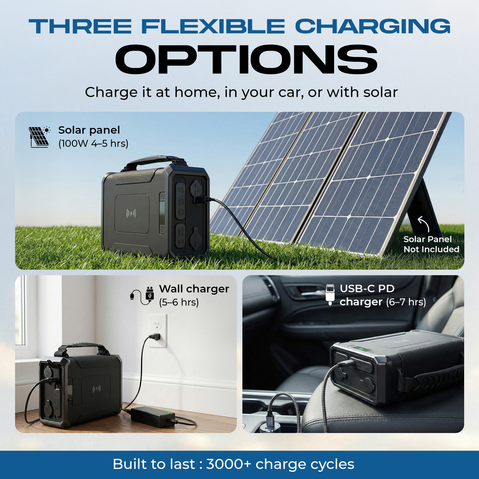 • Smart Safety & Rapid Recharge. Built-in BMS protects against overcharging, over-discharge, and short circuits. Three recharge options: AC adapter (5-6 hours), USB-C PD (6-7 hours), or solar panel (4-5 hours).