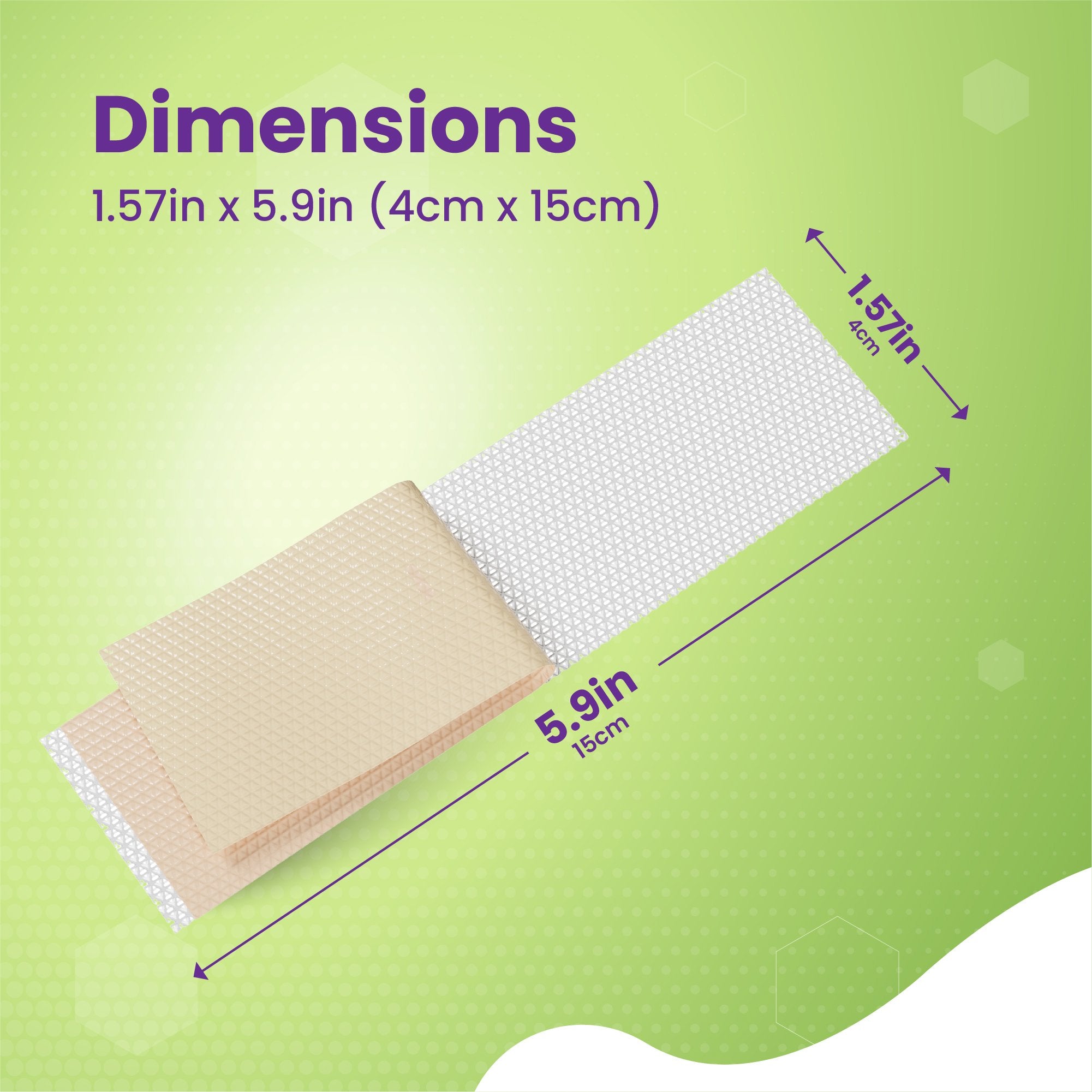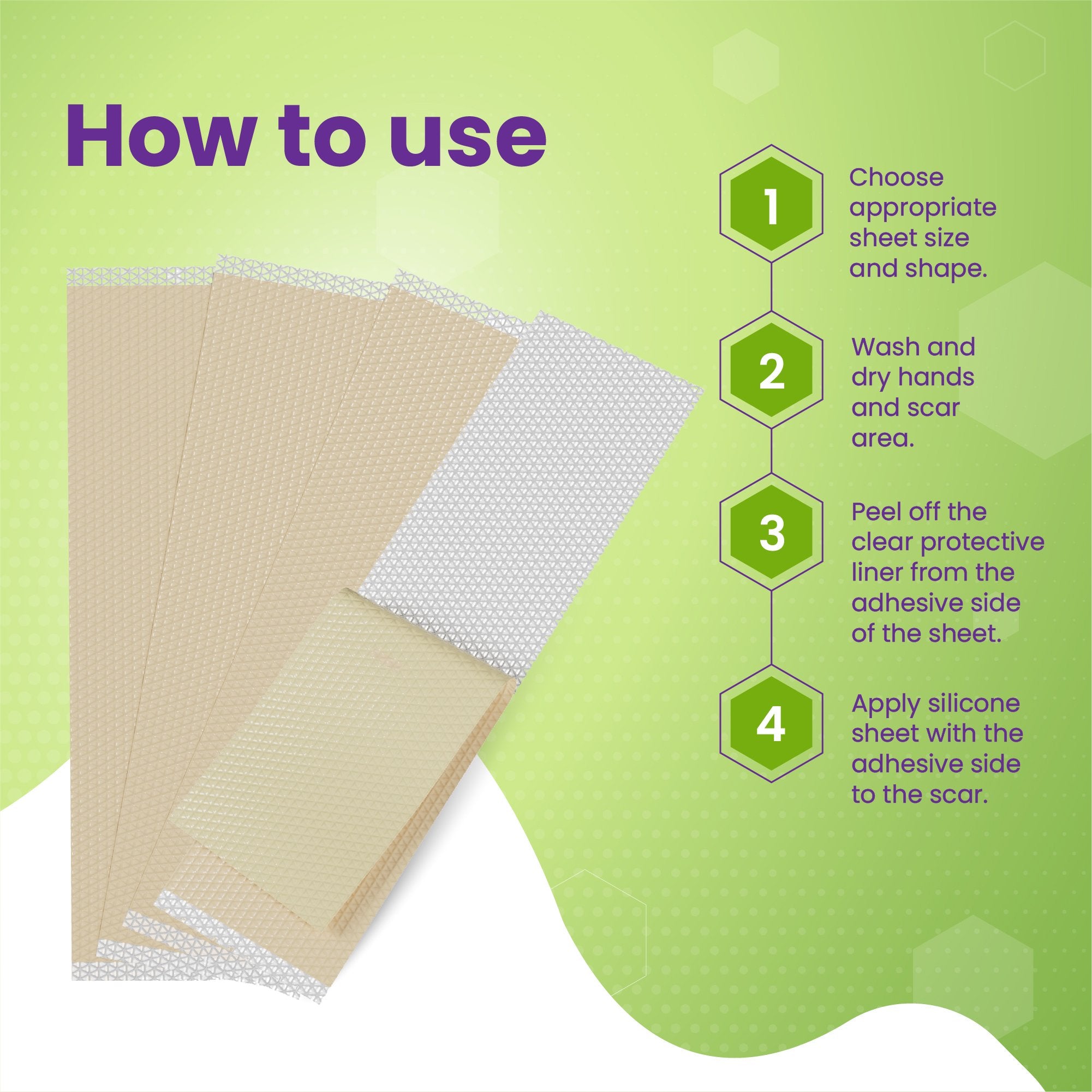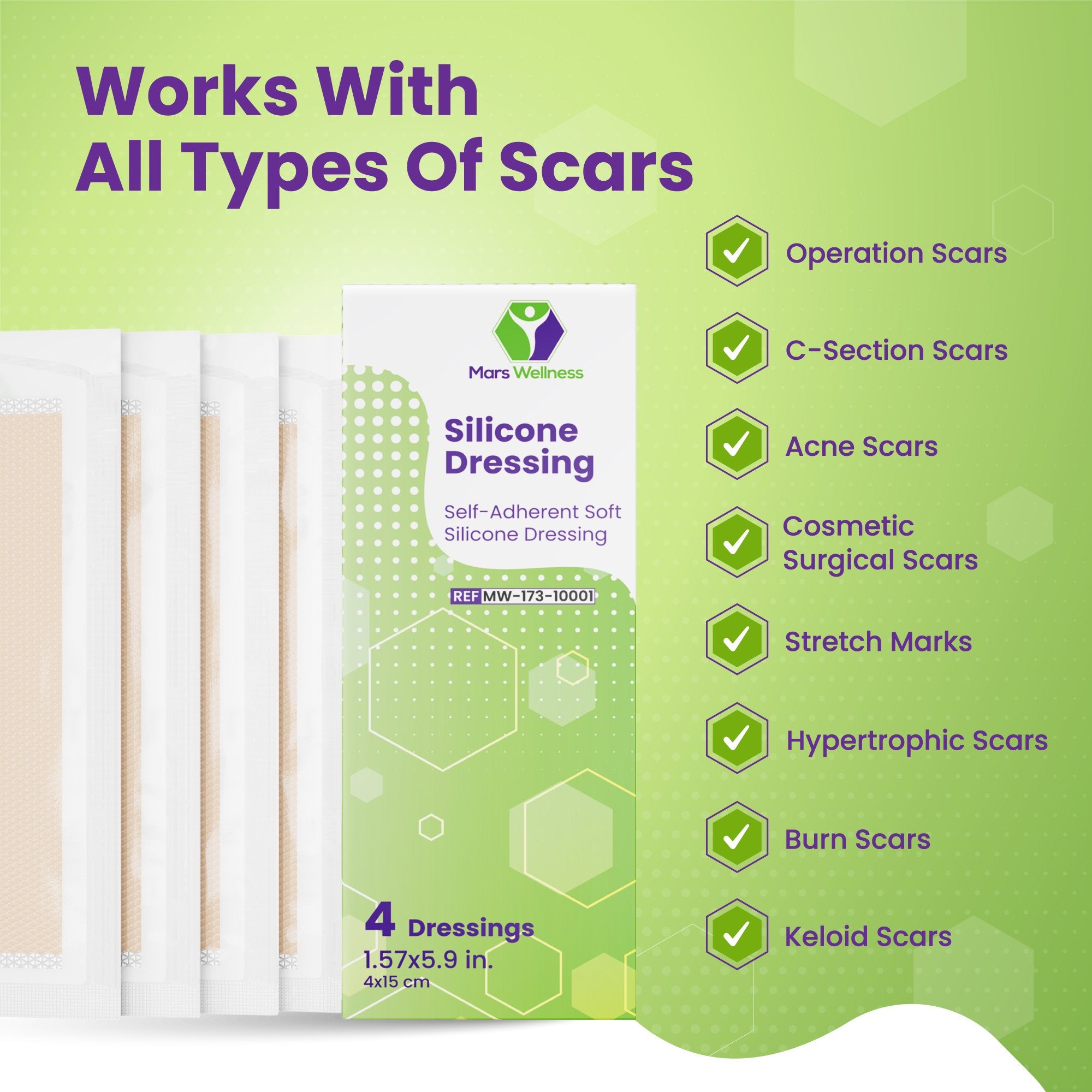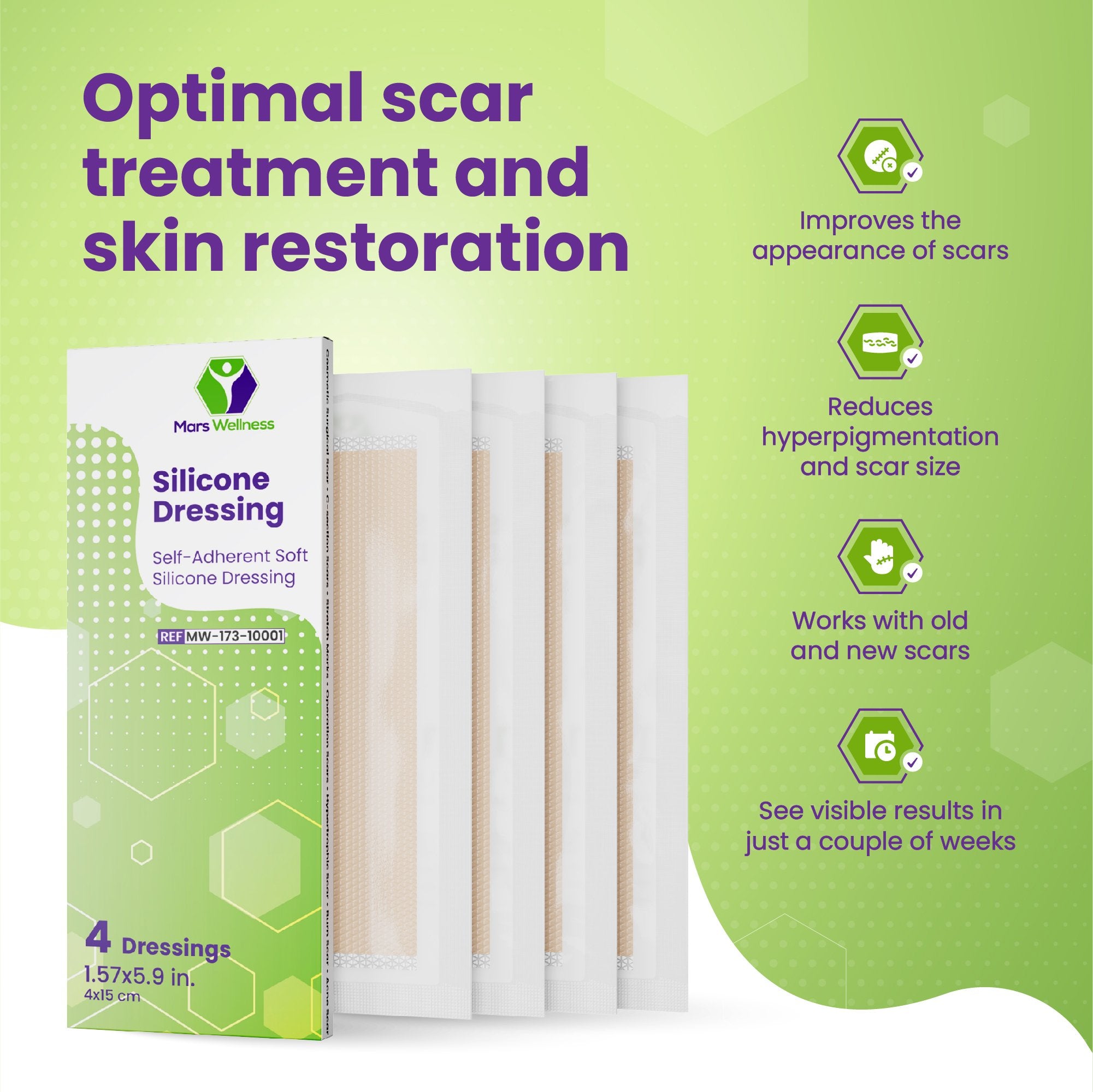 Try the new Mars Wellness Medical Silicone Dressing for scar treatment. Our sheets are 1.57" x 5.9". And conveniently sold in packs of 4. Our Scar Sheets Effectively prevent the formation of scar and Softens the initial stage of scars and prevents further hyperplasia