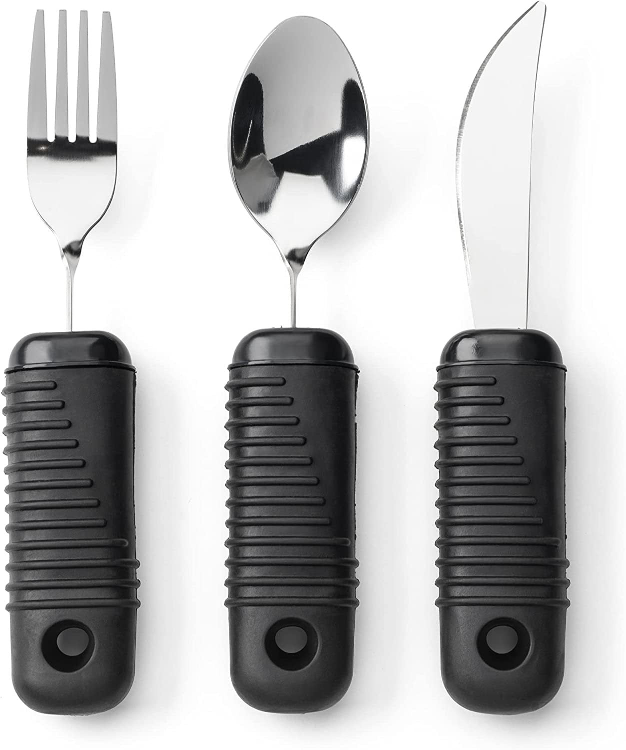 Introducing our 3-piece Weighted Utensils Set, designed to enhance stability and comfort while eating for elderly, hand tremors, and Parkinson's patients. This set includes a fork, knife, and spoon, all made of high-quality stainless steel that is built to last and withstand daily use. The added weight in the handle of these utensils helps to reduce hand tremors and shaking, making eating more comfortable and manageable for those who may have difficulty with traditional utensils. The extra weight provides a more secure and comfortable grip, allowing for more precision and control while eating. This makes it an ideal solution for those who may have difficulty eating, whether it's due to age, hand tremors, or Parkinson's disease. Comfortable design, the comfortable rubber grip makes it easy to use and hold on to, often patients find it hard to grip a thin standard stainless steel utensils due to arthritis or parkinsons, our rubber grip is wider and easier to hold. Cleaning these utensils is a breeze. The stainless steel construction makes them easy to clean and maintain, simply wash in warm, soapy water and dry thoroughly. These utensils are dishwasher safe and can be easily cleaned by hand as well. It is very easy to maintain which makes it an ideal option for everyday use. In conclusion, our 3-piece Weighted Utensils for hand tremors is an ideal solution for those who may have difficulty eating. It provides enhanced stability and comfort while eating, and it's built to last and withstand daily use. The sleek and modern design will complement any dining setting, and the easy-to-clean stainless steel construction makes it an ideal option for everyday use. This set is perfect for those who have difficulty eating, and it can be used in a variety of settings, including home, assisted living, and rehabilitation centers.