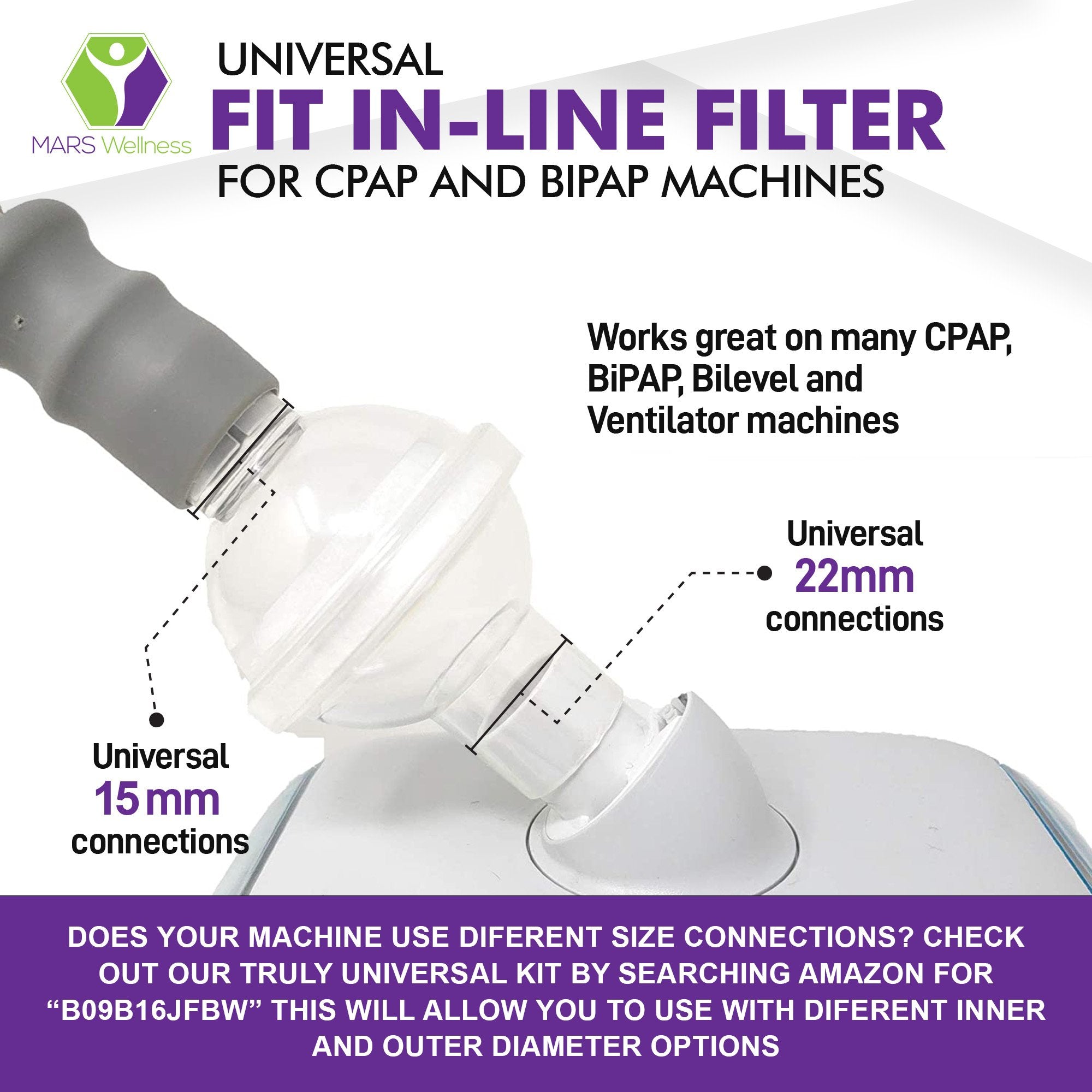 With viral and bacterial filtration efficiencies of over 99.99% the Hudson 1605 Universal Inline CPAP Filter comes complete with holders as shown. Hudson's filter technology helps stop the viruses and bacteria that often plague sleep therapy users creating a clean, sterile environment for a healthy night's sleep. A MUST HAVE FOR ALLERGY SUFFERERS Inline Bacterial Viral Filters are a great option for sleep therapy users who are prone to sickness or allergies. They actively clean the air as it leaves your CPAP or BiPAP machine, working in conjunction with the machine's built in filters, to provide exceptionally clean air throughout the night. SAFE, EASY & CONVENIENT These Universal Inline Bacterial Viral Filters are naturally hydrophobic so they allow maximum filtration with a minimum loss of air flow. Our Universal Mars Wellness Filters are easy to install and should not require re- calibration on most CPAP machines. Simply attach the filter to your machine between the air outlet and your standard CPAP tubing. After that, turn on your machine and experience a steady flow of clean, pure, good tasting air.Â